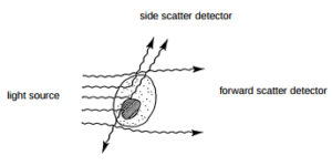 The sample is put into the Flow Cytometer and it passes through a “Giant Laser”…er well… not exactly giant, but it does hit each and every cell as they pass through in a single file manner. This is where we get the count. As each cell passes through the laser it causes light to scatter. There are two ways it scatters. We have the forward scatter, which can be correlated to the size of the cell and the side scatter which can be correlated to the granularity of the cell.
